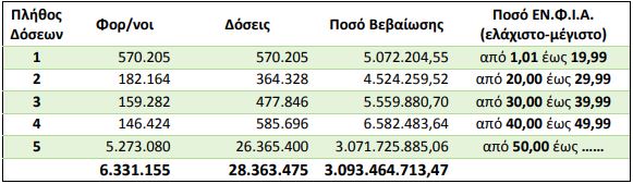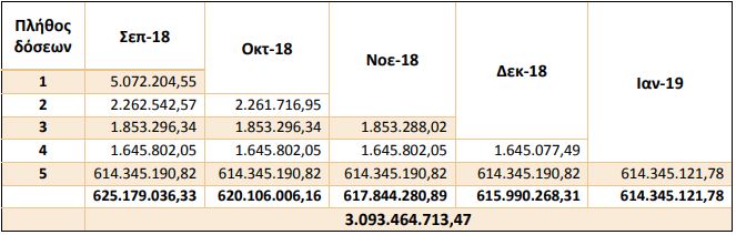 Οι δόσεις που προκύπτουν είναι από 1 έως 5, με ελάχιστο ποσό δόσης 10 €. Εκτείνονται από Σεπ 2018 έως Ιαν 2019 και σε πλήθος είναι περίπου 28,36 εκ. δόσεις, ως εξής: