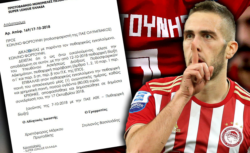 Την ποινή της μιας αγωνιστικής επέβαλε η πειθαρχική επιτροπή της Σούπερ Λίγκα στον Κώστα Φορτούνη, όπως ανακοινώθηκε κι επίσημα από την διοργανώτρια αρχή του πρωταθλήματος. Ο διεθνής μέσος του Ολυμπιακού τιμωρήθηκε για την συμπεριφορά του μετά το γκολ που πέτυχε στο παιχνίδι με την ΑΕΚ στο ΟΑΚΑ και αυτό σημαίνει ότι θ’ απουσιάσει από το κυριακάτικο παιχνίδι πρωταθλήματος των ερυθρόλευκων, απέναντι στον ΟΦΗ. Στον διεθνή μέσο του Ολυμπιακού επιβλήθηκε και πρόστιμο 80 ευρώ. Νωρίτερα ο διεθνής άσος των ερυθρόλευκων είχε ζητήσει συγνώμη στην απολογία του, τονίζοντας πως έχει μετανιώσει.