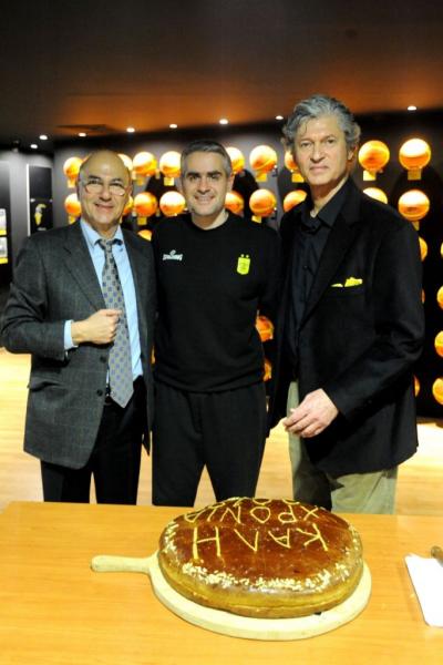 Την πίτα έκοψε ο Πρόεδρος του Σωματείου Παλαιμάχων Καλαθοσφαιριστών, Χάρης Παπαγεωργίου, έχοντας δίπλα του τον Γενικό Γραμματέα, Διονύση Ανανιάδη και τον Ταμία, Πέτρο Ράσογλου.