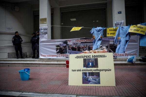 Η ΠΟΕΔΗΝ έχει κρεμάσει έξω από το υπουργείο ρόμπες στις οποίες αναγράφεται η λέξη «ανεργία», έχει τοποθετήσει κάδους απορριμμάτων με σκούπες και φαράσια στο πεζοδρόμιο ενώ έχει στήσει πάγκο στον οποίο έχει κρεμάσει αφίσα του Αλέξη Τσίπρα σημειώνοντας τη φράση «ολιγαρκής αφθονία» και μοιράζει κυπελλάκια με φασολάδα.