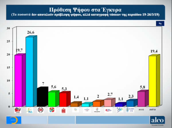 Μεγάλο προβάδισμα στη Νέα Δημοκρατία έναντι του ΣΥΡΙΖΑ δίνει νέα δημοσκόπηση της εταιρείας ALCO.