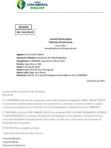 Ο λόγος ήταν η αποβολή του Αργεντινού σούπερ σταρ για την αψιμαχία με τον Γκάρι Μεδέλ της Χιλής. Συγκεκριμένα, η ομοσπονδία της Νοτίου Αμερικής ανακοίνωσε πως ο Αργεντινός σούπερ σταρ τιμωρήθηκε με μία αγωνιστική, αλλά και πρόστιμο 1.400 ευρώ, τρεις βδομάδες μετά το τέλος της διοργάνωσης.