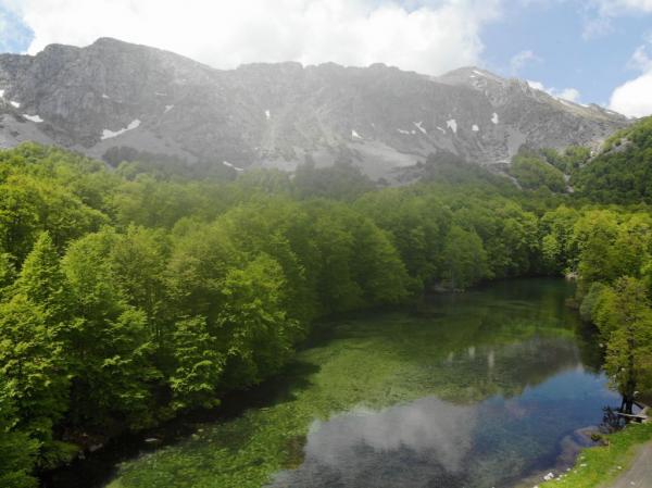 Με την ψηλότερη κορυφή του Λάκμου, την Τσουκαρέλα στα 2.295 μέτρα, πάνω από την αλπική λίμνη το τοπίο, είναι επιβλητικό.