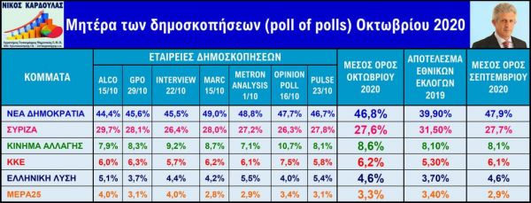Στον πίνακα που δημοσιεύεται στο tinealarissa, και επιμελήθηκε ο Νίκος Καρδούλας (Αγρονόμος Τοπογράφος Μηχανικός του Ε.Μ.Π. – MSc _UK και Συνταγματάρχης ε.α.) απεικονίζονται οι 7 έρευνες του Οκτωβρίου μετά τις παραπάνω αναγωγές, ο μέσος όρος τους, τα ποσοστά των κομμάτων στις εθνικές εκλογές 2019 και ο αντίστοιχος μέσος όρος των δημοσκοπήσεων του Σεπτεμβρίου.
