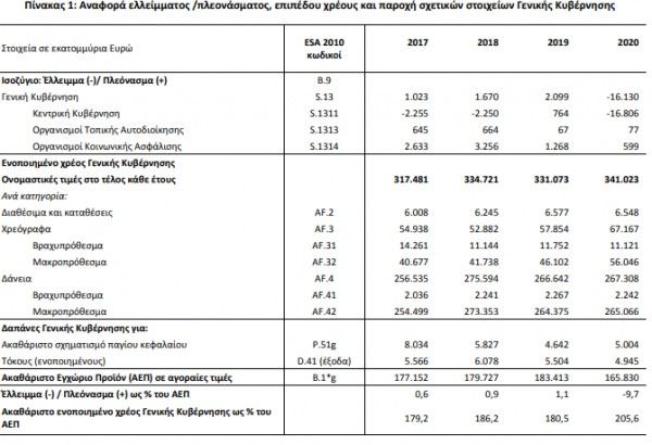 Το έλλειμμα της Γενικής Κυβέρνησης για το έτος 2020, σύμφωνα με το ESA 2010, εκτιμάται στα -16,1 δισ. ευρώ (- 9,7% επί του Ακαθάριστου Εγχώριου Προϊόντος), ενώ το ακαθάριστο ενοποιημένο χρέος της Γενικής Κυβέρνησης σε ονομαστικές τιμές στο τέλος του 2020 εκτιμάται στα 341δισ. ευρώ (205,6% επί του Ακαθάριστου Εγχώριου Προϊόντος).