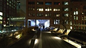 Το ντιζαϊνάτο, δεκαοκταόροφο ξενοδοχείο Standard και το ιστορικό, επίσης δεκαοκταόροφο, συγκρότημα London Terrace «φύονται» εκατέρωθεν της γέφυρας αλλά σε κάποια απόσταση. Από άλλα κτίρια όμως περνάς ξυστά! Όσο διακριτικός κι αν προσπαθείς να είσαι, είναι αδύνατον να μην πέσει το μάτι σου πάνω στους ενοίκους που κάνουν τη βραδυνή τους γυμναστική ή μαγειρεύουν ή περιμένουν να τελειώσει η πλύση τους στο πλυντήριο/στεγνωτήριο της πολυκατοικίας. Δεν είμαστε εμείς ηδονοβλεψίες –αυτοί είναι επιδειξίες, αφού έχουν τις κουρτίνες τραβηγμένες (για την ακρίβεια, κάποιοι δεν έχουν καν κουρτίνες), και αφού διαμερίσματα και λόμπυ είναι εξίσου αριστοτεχνικά φωτισμένα με τη βλάστηση επί της «Υψηλής Γραμμής.» Οι ένοικοι πληρώνουν ολόκληρες περιουσίες για να μείνουν εδώ –άρα μάλλον θέλουν να τους βλέπουμε… (Δεν πρόσεξα κανέναν να κοιτάζει προς τα έξω, εκτός από μια γάτα που κάθεται μεγαλόπρεπα στο παράθυρο και χαζεύει τους λιγοστούς διαβάτες επί της πασαρέλας.)