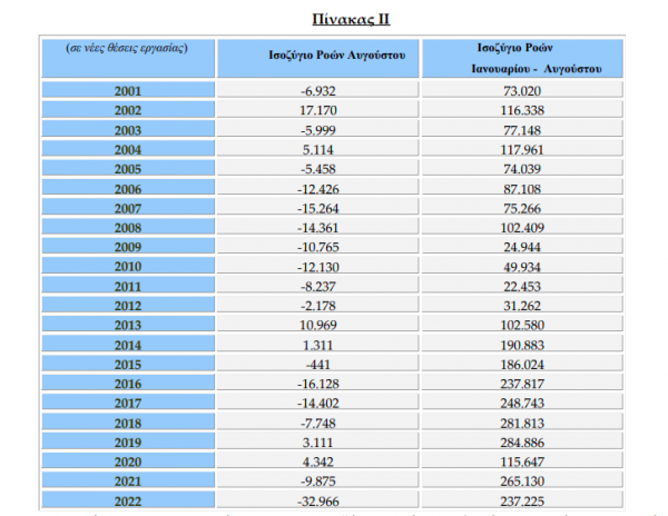 Ένα αξιοσημείωτο ακόμα στοιχείο είναι ότι το αρνητικό ισοζύγιο του φετινού Αυγούστου (-32.966) δηλαδή οι απώλεια θέσεων εργασίας είναι η χειρότερη επίδοση που έχει καταγραφεί μήνα Αύγουστο από το 2001 μέχρι σήμερα. Και μάλιστα η αμέσως χειρότερη επίδοση είναι τον Αύγουστο του 2016 με απώλεια θέσεων εργασίας κατά 16.128. Δηλαδή το φετινό Αύγουστο διπλασιάστηκε το αρνητικό ρεκόρ.