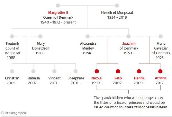Συγκεκριμένα, η 82χρονη μονάρχης αποκάλυψε πριν από περίπου δύο εβδομάδες ότι θα αφαιρέσει τους πριγκιπικούς τίτλους από τα τέσσερα παιδιά του μικρότερου γιου της, πρίγκιπα Γιόακιμ, δηλαδή τον 23χρονο Νικολάι, τον 20χρονο Φέλιξ, τον 13χρονο Χένρικ και την 10χρονη Αθηνά.