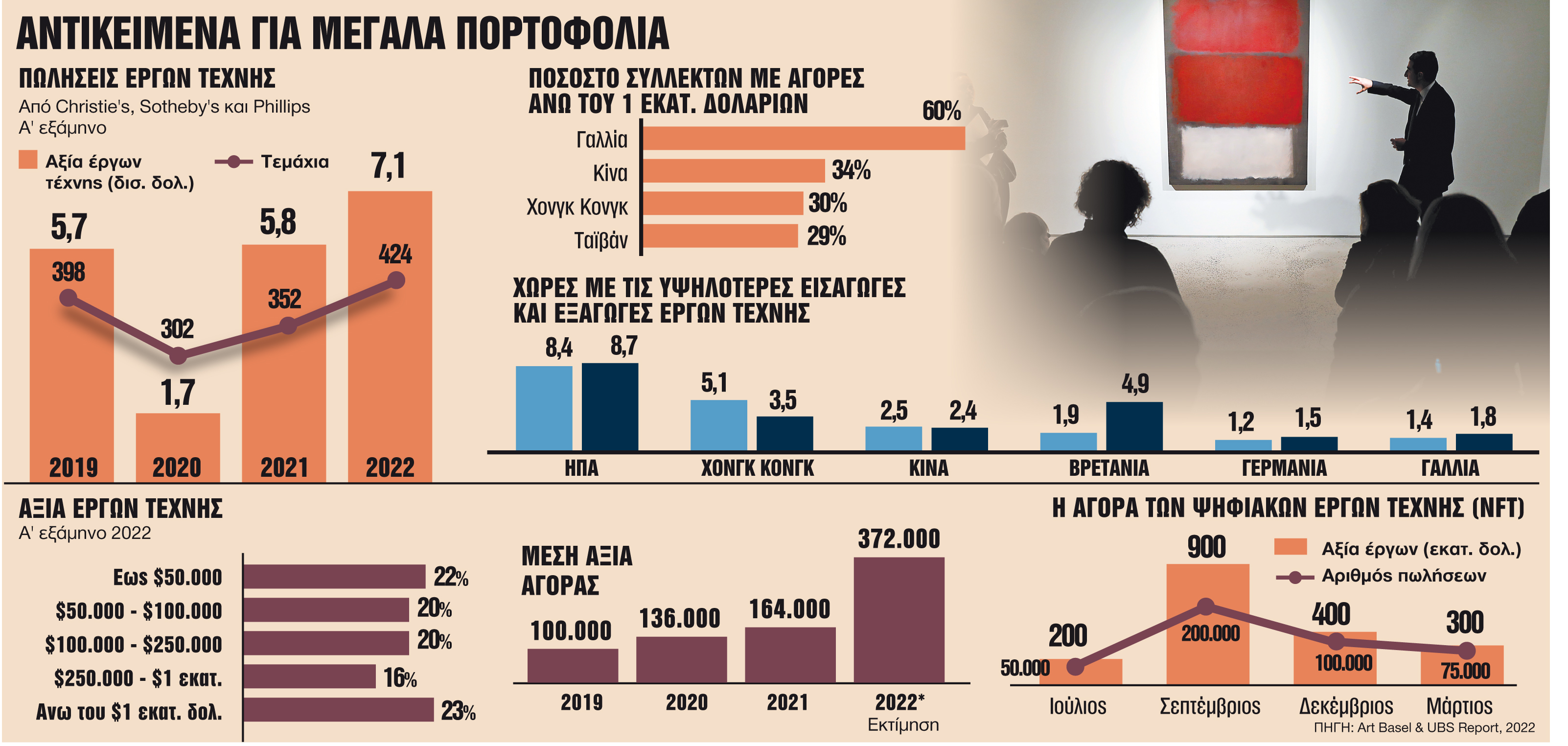 Η αγορά τέχνης αποτελεί ένα πανάκριβο σπορ. Απευθύνεται σε λίγους που διαθέτουν πολύ χρήμα και έχουν πρόσβαση σε διεθνείς αγορές, μεγάλους οίκους και γνωστούς συλλέκτες. Αρκεί να αναφερθεί ότι μόνο τρεις μεγάλοι οίκοι (Christie’s, Sotheby’s και Phillips), στο πρώτο εξάμηνο του έτους πραγματοποίησαν 424 δημοπρασίες παγκοσμίως συνολικού τζίρου 7,1 δισ. ευρώ, σύμφωνα με την ετήσια έκθεση της Basel Art. Ο συνολικός τζίρος για το 2022 παγκοσμίως υπολογίζεται στα 64 δισ. ευρώ, με τη μέση αξία αγοράς να διαμορφώνεται στα 372.000 δολάρια.