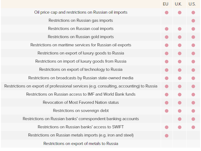 Τύποι κυρώσεων κατά της Ρωσίας που ανακοινώθηκαν ή εφαρμόζονται στην ΕΕ, στο Η.Β. και στις Η.Π.Α.