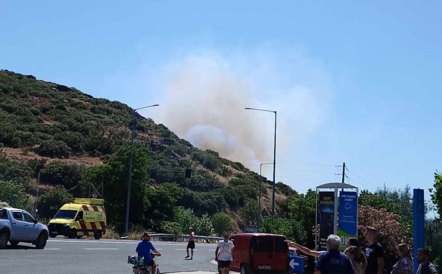 Γρήγορα η φωτιά επεκτάθηκε καίγοντας ξερά χόρτα και θάμνους σε δασική έκταση κατά μήκος της εθνικής οδού.