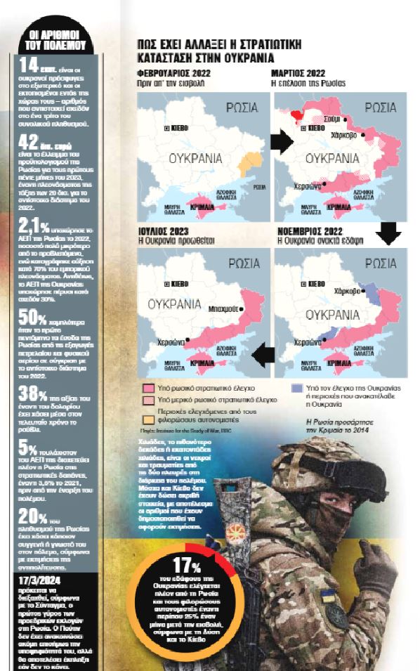 Αυτές οι 500 ημέρες, πέρα από τις απώλειες σε ανθρώπινες ζωές στις δύο εμπόλεμες χώρες, προκάλεσαν μια ακόμη οικονομική και ενεργειακή κρίση, η οποία συνοδεύεται από ένα τεράστιο κύμα ακρίβειας και κερδοσκοπίας. Εχουν επαναφέρει πάνω από την ανθρωπότητα το φάντασμα ενός Τρίτου Παγκόσμιου Πολέμου, ενδεχομένως και πυρηνικού. Εχουν δε αναγκάσει, δίχως αμφιβολία, ακόμη και τον μεγάλο πρωταγωνιστή να αναλογιστεί (έστω κι αν δεν το παραδέχεται δημοσίως) εάν πέτυχε έστω και κάτι από τους στόχους που είχε θέσει – ή εάν, αντιθέτως, έχει χάσει πολύ περισσότερα από όσα πιθανώς θεωρεί ότι κέρδισε.
