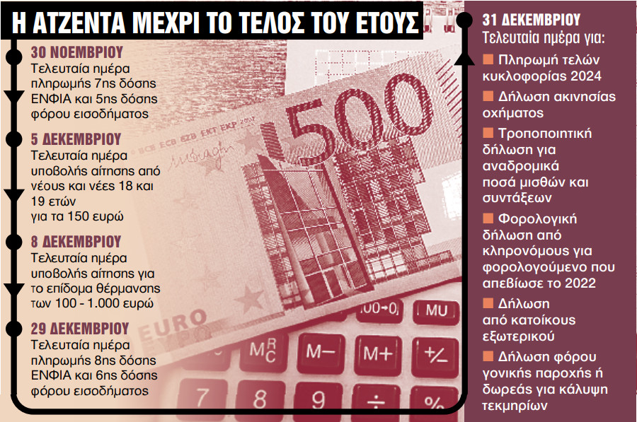 Πληρωμές φόρων. Την Πέμπτη λήγει η προθεσμία για την πληρωμή της 7ης δόσης του ΕΝΦΙΑ και της 5ης δόσης του φόρου εισοδήματος, ενώ στις 29 Δεκεμβρίου θα πρέπει να πληρωθεί η 8η δόση ΕΝΦΙΑ και η 6η δόση του εκκαθαριστικού της φορολογικής δήλωσης. Οι φορολογούμενοι που βρίσκονται σε πρόγραμμα ρύθμισης οφειλών θα πρέπει στις συγκεκριμένες προθεσμίες να πληρώσουν τις δόσεις, ενώ στο τέλος Δεκεμβρίου θα πρέπει να εξοφληθούν τα τέλη κυκλοφορίας του 2024.