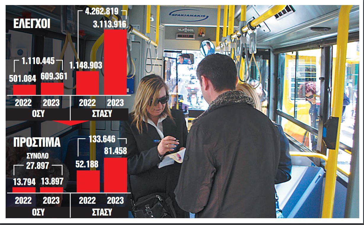 Συγκεκριμένα, σύμφωνα με τα στοιχεία του ΟΑΣΑ, το 2023 βεβαιώθηκαν 13.897 πρόστιμα για λαθρεπιβίβαση στα οδικά μέσα του ΟΣΥ (λεωφορεία και τρόλεϊ) από 609.361 ελέγχους (2,3% των ελέγχων) και 81.458 πρόστιμα στα μέσα της ΣΤΑΣΥ (Μετρό, ΗΣΑΠ, Τραμ) από 3.113.916 ελέγχους (2,6% των ελέγχων). Σε σχέση με το 2022, τα πρόστιμα στα οδικά μέσα (ΟΣΥ) παρέμειναν λίγο – πολύ στα ίδια μεγέθη (13.794), όμως το ποσοστό των προστίμων επί των ελέγχων ήταν ελαφρώς μεγαλύτερο (2,75%), καθώς οι έλεγχοι ήταν λιγότεροι (501.084). Στα μέσα σταθερής τροχιάς (ΣΤΑΣΥ) ο αριθμός των προστίμων αυξήθηκε σημαντικά (κατά 29.270 ή κατά 56%), με τη διαφορά να οφείλεται στον πολλαπλασιασμό των ελέγχων (1.965.013 περισσότεροι από το 2022, αύξηση 171%). Το ποσοστό των προστίμων επί των ελέγχων στα μέσα της ΣΤΑΣΥ ήταν αρκετά υψηλότερο το 2022 (4,5%).
