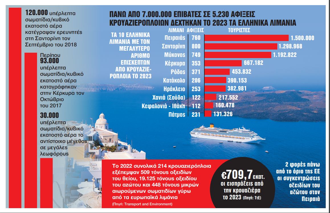 Σε έκθεση του 2023 το ευρωπαϊκό think tank Transport and Environment (Μεταφορές και Περιβάλλον) κατέταξε τον Πειραιά στην τρίτη θέση όσον αφορά την επιβάρυνση της ατμόσφαιρας από τα κρουαζιερόπλοια, πίσω μόνο από τη Βαρκελώνη και την Τσιβιταβέκια της Ρώμης με το ομώνυμο λιμάνι. Την πρώτη δεκάδα συμπληρώνουν δύο ακόμα ελληνικοί προορισμοί: πρόκειται για τη Μύκονο στην όγδοη θέση και τη Σαντορίνη στην ένατη. Συνολικά, όπως διαπιστώνεται στην ίδια έκθεση, το 2022, 214 κρουαζιερόπλοια εξέπεμψαν 509 τόνους οξειδίων του θείου, 19.125 τόνους οξειδίου του αζώτου και 448 τόνους μικρών αιωρούμενων σωματιδίων γύρω από τα ευρωπαϊκά λιμάνια.