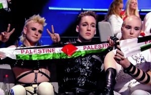 Ομως και το Παλαιστινιακό έχει συχνά βρει τον δρόμο του για τη Eurovision. Το 2019, χρονιά κατά την οποία ο διαγωνισμός έλαβε χώρα στο Ισραήλ, τα μέλη του συγκροτήματος Hatari, που εκπροσωπούσε την Ισλανδία, κατά τη διάρκεια των αποτελεσμάτων σήκωσαν κασκόλ με τη σημαία της Παλαιστίνης.