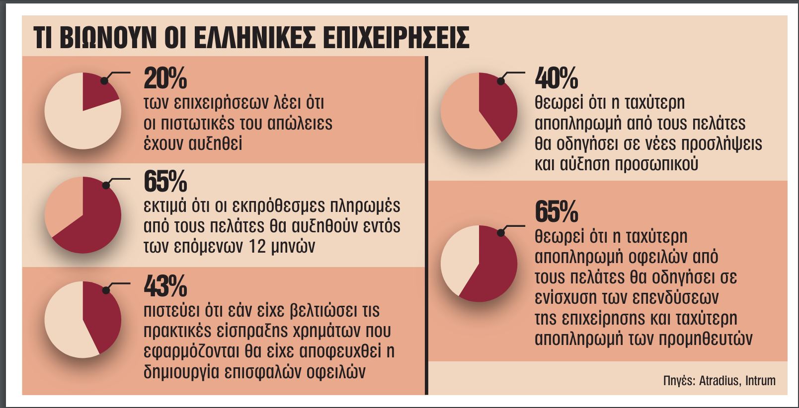 Πάντως το 57% των επιχειρήσεων αναφέρει ότι θα επιθυμούσε να εξοφλεί νωρίτερα τους προμηθευτές, κάτι που δεν είναι εφικτό επί του παρόντος. Οι ελληνικές επιχειρήσεις σύμφωνα με στοιχεία της Intrum δηλώνουν ότι δαπανούν 73 εργάσιμες ημέρες ετησίως σε θέματα διαχείρισης πληρωμών, ενώ πιστεύουν ότι η ταχύτερη αποπληρωμή οφειλών από τους πελάτες θα οδηγήσει σε ενίσχυση των επενδύσεών τους, σε ταχύτερη αποπληρωμή των προμηθευτών (65%), σε βελτίωση του περιβαλλοντικού αποτυπώματος (59%), σε επενδύσεις σε νέα προϊόντα και υπηρεσίες (57%), σε υιοθέτηση της ψηφιακής καινοτομίας (46%) και σε εφαρμογή ψηφιακής στρατηγικής (43%).