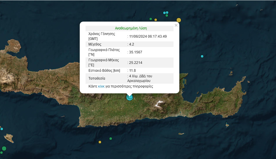 Δύο σεισμικές δονήσεις σημειώθηκαν το πρωί της Τρίτης 11 Ιουνίου στο πολύπαθο Αρκαλοχώρι του του δήμου Μινώα Πεδιάδος, στο Ηράκλειο της Κρήτης.