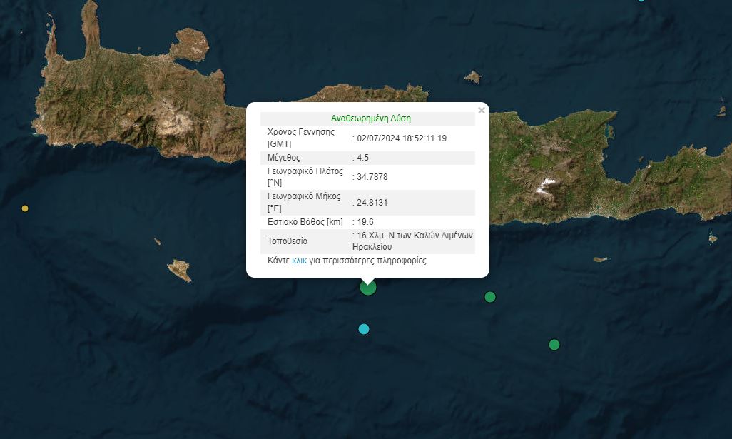 Σεισμός, μεγέθους 4,5 βαθμών στην κλίμακα Ρίχτερ, σημειώθηκε το βράδυ της Τρίτης (2/7) σε θαλάσσιο σημείο νοτίως της Κρήτης, πολύ κοντά στο νησί.