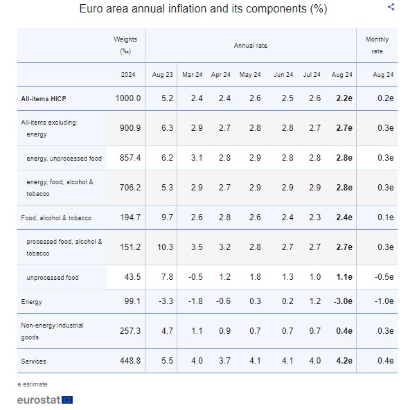 Αναφορικά με τις κύριες συνιστώσες του πληθωρισμού της ζώνης του ευρώ, οι υπηρεσίες έχουν τον υψηλότερο ετήσιο ρυθμό τον Αύγουστο (4,2%, έναντι 4,0% τον Ιούλιο), ακολουθούμενες από τα τρόφιμα, το αλκοόλ και τον καπνό (2,4%, έναντι 2,3% τον Ιούλιο), τα μη ενεργειακά βιομηχανικά αγαθά (0,4%, έναντι 0,7% τον Ιούλιο) και την ενέργεια (-3,0%, έναντι 1,2% τον Ιούλιο).