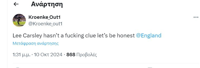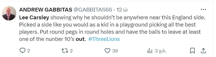 «Μισώ πως η FA επιλέγει κάθε φορά τον λάθος άνθρωπο», «Ο Λι Κάρσλεϊ επέλεξε την ενδεκάδα σαν ένα 15χρονο αγόρι στο FIFA, στριμώχνοντας όλους τους αγαπημένους του παίκτες στην ομάδα. Φαλακρέ ηλίθιε. Διώξτε τον», «Αφελές κοουτσάρισμα από τον Λι Κάρσλεϊ.