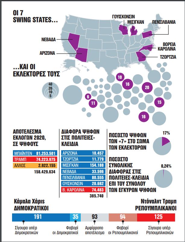 Υστερα από τα παραπάνω, μάλλον δεν πρέπει να απορεί κανείς για το γεγονός ότι Χάρις και Τραμπ δίνουν πολύ μικρότερη σημασία στο πανεθνικό τους ποσοστό και πολύ μεγαλύτερη στις επτά πολιτείες – κλειδιά που θα κρίνουν την αναμέτρηση.