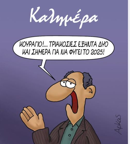 Ο Αρκάς στο σημερινό του σκίτσο μας παρουσιάζει έναν κύριο να στέλνει την καλημέρα του λέγοντας: «Καλημέρα, κουράγιο. Τριακόσιες εξήντα δύο και σήμερα για να φύγει το 2025.»