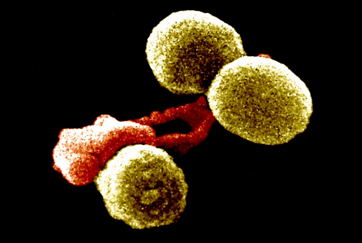 Βακτήρια Streptococcus pneumoniae (κίτρινο) δέχονται επίθεση από κύτταρο του ανοσοποιητικού συστήματος (κόκκινο). Πηγή: NIH