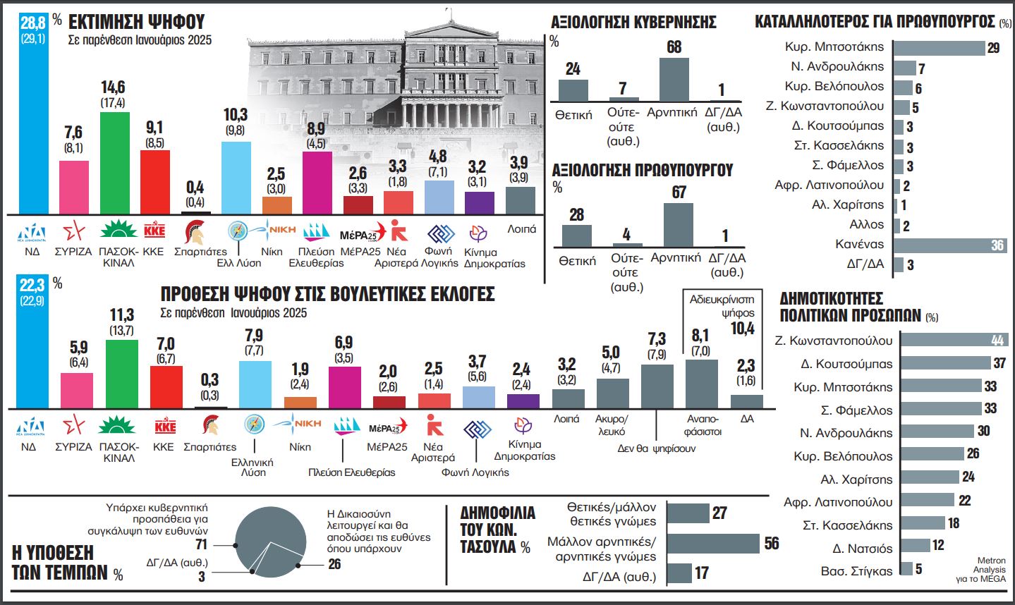 Σε ό,τι αφορά την εκτίμηση ψήφου, η ΝΔ προηγείται με 28,8%, με μικρή πτώση από τον Ιανουάριο, που είχε μετρηθεί στο 29,1%.