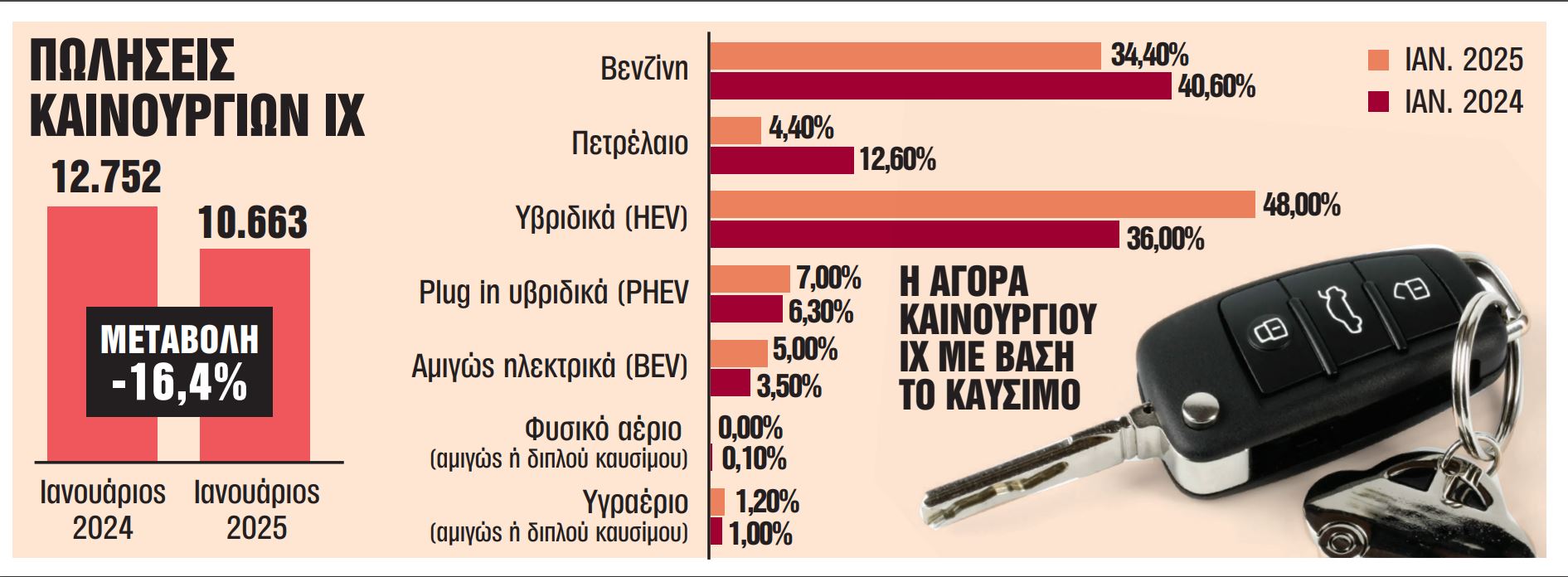 Για πρώτη φορά, τα μοντέλα βενζίνης πέρασαν στη δεύτερη θέση, αγγίζοντας σε ποσοστό το 34,4% έναντι 40,6% τον αντίστοιχο μήνα του 2024.