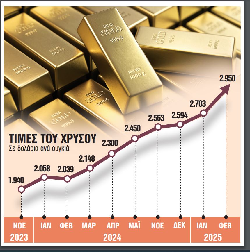 Ποτέ η λάμψη του χρυσού δεν ήταν τόσο ισχυρή όσο σήμερα. Η τιμή του πολύτιμου μετάλλου οδεύει ολοταχώς προς τα 3.000 δολάρια η ουγκιά, έχοντας ήδη πιάσει τα 2.950 δολάρια, αφού οι γεωπολιτικές ανησυχίες και οι φόβοι για εμπορικό πόλεμο από τους νέους δασμούς που απειλεί να επιβάλει ο Ντόναλντ Τραμπ κάνουν τους επενδυτές να στρέφονται σε πιο ασφαλή καταφύγια.