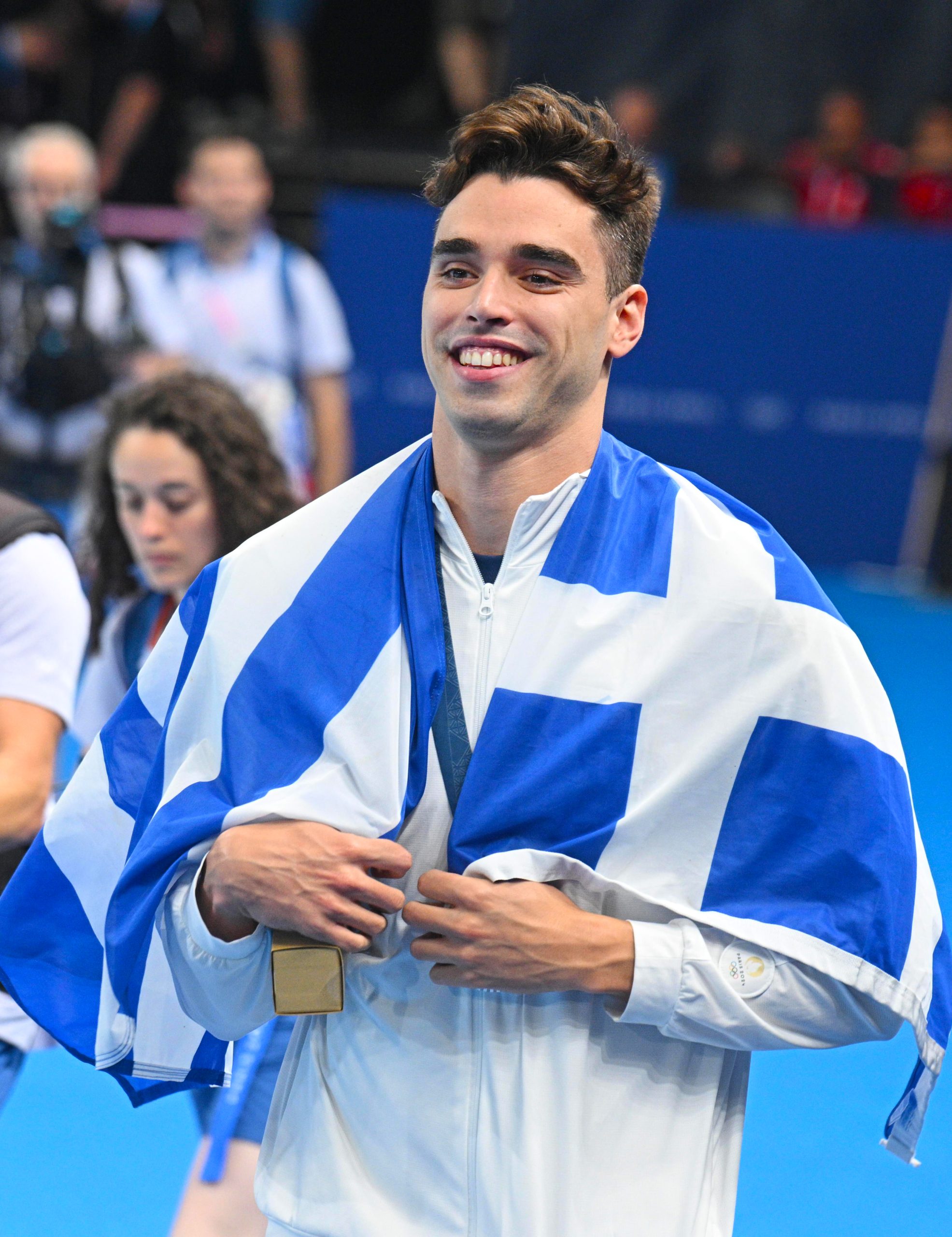 Χαμόγελα και υπερηφάνεια: ο Απόστολος Χρήστου πανηγυρίζει το ασημένιο μετάλλιο στα 200 μ. ύπτιο στο Παρίσι. Μια ιστορική στιγμή αφιερωμένη στα 100 χρόνια του Ολυμπιακού
