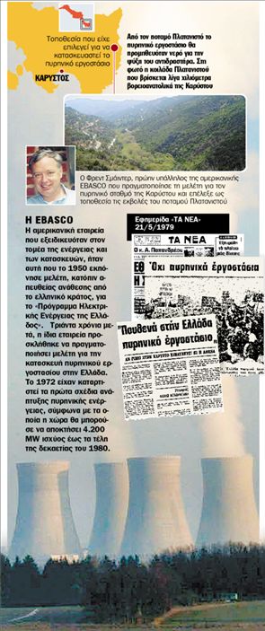 «Έπειτα από διεξοδική μελέτη των υποψήφιων ελληνικών περιοχών, το επιστημονικό επιτελείο της ΕΒΑSCΟ κατέληξε στην πρόταση της Καρύστου για την κατασκευή του πυρηνικού εργοστασίου. Το 1977 μόλις είχα προσληφθεί στην εταιρεία και ήταν η πρώτη μου επαγγελματική αποστολή εκτός ΗΠΑ. Θυμάμαι ότι υπήρχαν μεγάλες αντιδράσεις από τους κατοίκους της περιοχής, γινόταν αυτό που θα χαρακτήριζε κανείς ξεσηκωμός», λέει στα «ΝΕΑ» ο Φρέντερικ Σμάιντερ, πρώην υπάλληλος της ΕΒΑSCΟ στον τομέα των γεωλογικών- γεωφυσικών ερευνών.