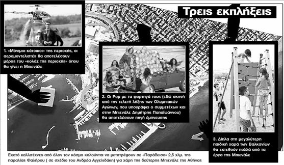 Ένας καταυλισμός Τσιγγάνων και μια μαρίνα, ξεχασμένα από τους Ολυμπιακούς Αγώνες κτίρια και η μεγαλύτερη παιδική χαρά των Βαλκανίων το ερχόμενο καλοκαίρι θα αποτελούν… «Παράδεισο» με μόνιμους κατοίκους, αερομοντελιστές και χειμερινούς κολυμβητές και εποίκους περισσότερους από 100 καλλιτέχνες απ΄ όλον τον κόσμο. Αφορμή, η Μπιενάλε της Αθήνας που φαίνεται πως κέρδισε το στοίχημα και ετοιμάζεται πυρετωδώς για τη δεύτερη διοργάνωσή της το ερχόμενο καλοκαίρι στο Φάληρο με θέμα Ηeaven («Παράδεισος»).
