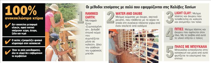 Το μικρό οικόπεδο στις Καλύβες όπου εξελίσσεται το πρόγραμμα έχει μετατραπεί σε εργοτάξιο. Ανά ομάδες, άλλοι αναλαμβάνουν το κοσκίνισμα του χώματος, άλλοι το ανακατεύουν με άχυρο και νερό και άλλοι κάνουν το χτίσιμο. «Επιλέξαμε τον πηλό», λέει η πολιτικός μηχανικός Ελένη Μπραουδάκη, «διότι είναι υλικό φυσικό, οικολογικό, μπορείς εύκολα να δημιουργήσεις. Μπορεί πάντως εύκολα να αξιοποιηθεί μαζικά για πολλές και μεγάλες κατασκευές και στην Ελλάδα και να υποκαταστήσει έως έναν βαθμό το τσιμέντο. Σε άλλες χώρες είναι συνηθισμένο υλικό. Τα τελευταία χρόνια, στη Γερμανία για παράδειγμα, πάρα πολλά σπίτια κατασκευάζονται με πηλό. Άλλωστε δεν είναι κάτι καινούργιο. Η παράδοση υπήρχε από παλιά και εδώ στην Κρήτη και στην υπόλοιπη Ελλάδα, απλώς εγκαταλείφθηκε όταν ήρθε το μπετόν, ένα υλικό ενεργοβόρο και επιβλαβές για το περιβάλλον». Ο χώρος όπου γίνονται οι εργασίες ανήκει στον αρχιτέκτονα Απόστολο Μουσουράκη, ο οποίος επίσης συμμετέχει στην κατασκευή. «Το χτίσιμο του σπιτιού σημαίνει και την έναρξη μια σειράς πειραμάτων. Η ομάδα μαζί με τους καθηγητές του Πολυτεχνείου Κρήτης κ. Μαρκόπουλο και κ. Πατηνάκη θα μελετήσει πώς λειτουργούν οι τεχνικές, θα κάνουμε μετρήσεις για την υγρασία, τη θερμοκρασία του εσωτερικού χώρου, τη συμπεριφορά του ξύλινου σκελετού», λέει. «Παλιότερα η κατασκευή τούβλων από πηλό ήταν συνηθισμένη τεχνική. Ουσιαστικά, χρησιμοποιώντας πιο σύγχρονες τεχνικές, προσπαθούμε να επαναφέρουμε ένα υλικό το οποίο ξεχάσαμε εδώ και 50 χρόνια. Ένα υλικό συμβατό με τον άνθρωπο. Κάθε βράδυ όταν πλενόμαστε και ξεκουραζόμαστε κοιτάμε τα χέρια μας: έπειτα από μιας μέρας δουλειά δεν έχουν ούτε μια αμυχή. Αν χρησιμοποιούσαμε τσιμέντο, τα χέρια μας θα ήταν καμένα και με σημάδια. Συν τοις άλλοις η πράσινη οροφή περιορίζει κατά πολύ την ηλεκτρομαγνητική ακτινοβολία. Επομένως έχουμε μια κατασκευή πιο φιλική στον άνθρωπο και στο περιβάλλον».