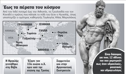 Έφτασε χίλια χρόνια πριν από τον Μεγάλο Αλέξανδρο στον Ινδό ποταμό. Πέρασε από την Αιθιοπία, έφτασε ώς τη Γροιλανδία και ίσως να πάτησε πρώτος το πόδι του στην Αμερική. Ένας από τους πιο γνωστούς ήρωες της παγκόσμιας μυθολογίας- ο Ηρακλής- δεν ήταν μόνο ένας σπουδαίος υδραυλικός, μηχανικός και υδρογεωλόγος, όπως μαρτυρούν πολλοί από τους δώδεκα άθλους του, αλλά και ο πρώτος που έκανε πράξη την παγκοσμιοποίηση και ο αρχιτέκτονας της μυκηναϊκής κοσμοκρατορίας, όπως υποστήριξε χθες το βράδυ σε ομιλία του, στο Πανεπιστήμιο Αθηνών, ο ομότιμος καθηγητής Γεωλογίας και μέλος του Κεντρικού Αρχαιολογικού Συμβουλίου Ηλίας Μαριολάκος.