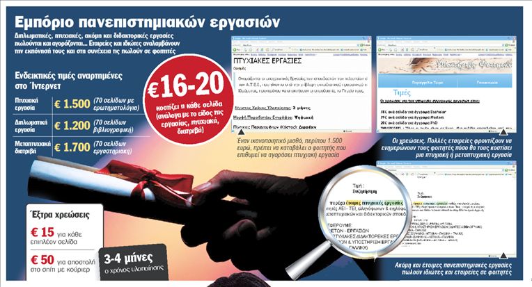 Με αυτό τον τρόπο επιχειρεί να προσελκύσει φοιτητές μια από τις δεκάδες εταιρείες που λειτουργούν στο Διαδίκτυο και αναλαμβάνουν να συγγράψουν πανεπιστημιακές εργασίες. Πρόκειται για τη «βιομηχανία» εκπόνησης πτυχιακών εργασιών, ακόμη και διδακτορικών διατριβών, που ανθεί στην Ελλάδα τα τελευταία χρόνια. Μπορεί πολλοί φοιτητές να ξενυχτούν, να ψάχνουν, να διαβάζουν και να καταβάλλουν μεγάλο κόπο για να ολοκληρώσουν μια εργασία τους, κάποιοι άλλοι όμως επιλέγουν άλλο τρόπο για να πάρουν το πτυχίο τους. Σημαντική προϋπόθεση, να έχουν χρήματα. Με ποσό περίπου όσο ένας ικανοποιητικός μηνιαίος μισθός, από 1.000 έως 1.500 ευρώ, μπορούν να αγοράσουν μια εργασία.