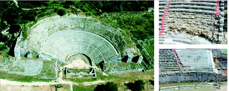 να λείπει το 1/3 του ύψους των εδωλίων. Για να σωθεί δε όσο από το αρχαίο υλικό έχει αποµείνει και έχει καταφέρει να αντέξει στη διάβρωση που προκαλούν οι καιρικές συνθήκες χρειάστηκε να ξηλωθεί, να συντηρηθεί και να επανατοποθετηθεί σε στεγανοποιηµένο υπόβαθρο «θώρακα» από τεχνητό λίθο που δεν θα επιτρέψει να συνεχιστεί η καταστροφή. Η χρήση φυσικού λίθου αποκλείστηκε καθώς πολύ γρήγορα θα άρχιζε και αυτός να διαβρώνεται ενώ δεν θα µπορούσε να εφαρµόσει πάνω στο αρχαίο υλικό.
