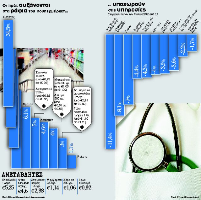 Την ίδια ώρα πάντως πτωτική πορεία τιμών ακολουθεί ο τομέας των υπηρεσιών: μείωση κατά μέσο όρο 11,4% των ασφαλίστρων αυτοκινήτων, των οικιακών υπηρεσιών 8,1%, των ενοικίων 7%, των υπηρεσιών συντήρησης και επισκευής 2,2, των διδάκτρων 4%, των υπηρεσιών κομμωτηρίου 3,6% και αναψυχής 3,9%.