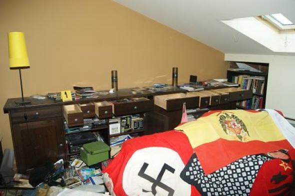 Σύμφωνα με αστυνομικές πηγές, είχε προηγηθεί το βράδυ της Κυριακής αυτοψία στους χώρους του σπιτιού από τον εισαγγελέα και άνδρες της κρατικής Ασφάλειας, κατά την οποία βρέθηκαν φωτογραφίες του Χίτλερ, σβάστικες και ένα 38αρι πιστόλι.