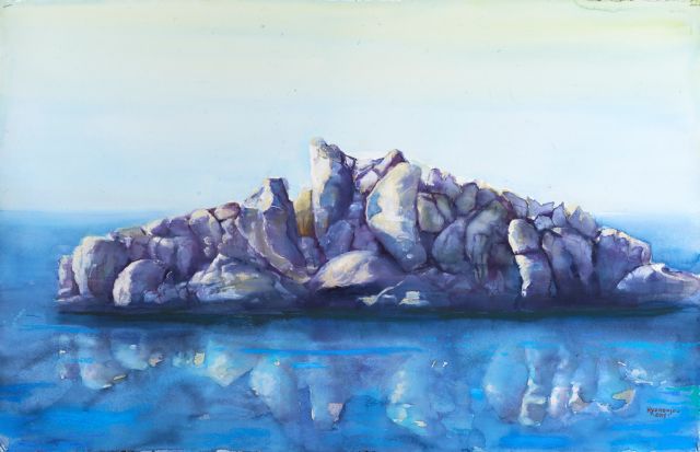 Αν μπει κάποιος στο εργαστήριο της Ειρήνης Ηλιοπούλου θα νομίζει ότι βρίσκεται μεσοπέλαγα. Παντού γύρω – τριγύρω θάλασσα και στην άκρη, όπου κοιτάξει το μάτι, βράχια. Λευκά, άλλοτε ψηλά, άλλοτε πιο χαμηλά, που αν τα παρατηρήσει θα διαπιστώσει πως μοιάζουν άλλοτε με λιοντάρια, άλλοτε με κουκουβάγιες. «Εφτιαξα τους βράχους επειδή ήθελα να μιλήσω για το νερό», μας λέει η ζωγράφος για τη 15η ατομική της έκθεση στην Αίθουσα Τέχνης Αθηνών (συνοδεύεται από κείμενο της Αντρέα Στροθ), πέντε χρόνια μετά την προηγούμενη. «Με ενδιέφερε η σχέση νερού και γης, δύο στοιχείων που είναι αντίθετα κι όμως συνυπάρχουν. Είναι αλληλένδετα όπως στις ανατολικές φιλοσοφίες το γιν και το γιαν. Οσο για τα ζωόμορφα σχήματα των βράχων δεν είναι αποτέλεσμα σκέψης. Προέκυψαν τυχαία», συνεχίζει για τη νέα της δουλειά – έξι ακουαρέλες (2Χ1,5 μ.) και 14 έργα μικρότερων διαστάσεων –, μια γεύση της οποίας είχαμε δει πέρυσι στην Art Athina. Πώς όμως από το λάδι βρέθηκε στην ακουαρέλα; Πώς από τις πολυπρόσωπες σκηνές, είτε δρόμου είτε εσωτερικού χώρου, επέλεξε τοπία με ελάχιστη φυσική παρουσία; «Είχα κουραστεί από τις προηγούμενες δουλειές μου, που ήταν εντελώς αυτοβιογραφικές. Αισθάνθηκα την επιθυμία για περιπέτεια και μαζί την ανάγκη να αλλάξω υλικό. Η ακουαρέλα σού δείχνει πού θα πας, αρκεί να την ακούσεις, να πειθαρχήσεις. Αυτή η δουλειά όμως έκρυβε και δυο εκπλήξεις: πρώτον, ανακάλυψα το ξηρό παστέλ με το οποίο καταπιάστηκα για πρώτη φορά. Και δεύτερον, την έλλειψη αφήγησης. Επειδή έχω συνηθίσει να έχω μορφές στα έργα μου, λειτουργώ αυτόματα, αλλά μετά καταλαβαίνω ότι πρέπει να τις θυσιάσω για να αφήσω το ζωγραφικό γεγονός να μιλήσει. Πιστεύω ότι θα γυρίσω αλλιώς στα λάδια έπειτα από αυτή τη δουλειά».