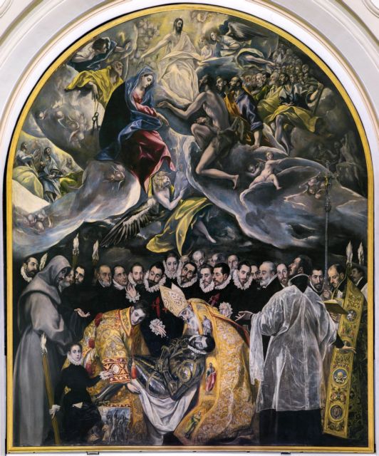 Ενας άγγελος μεταφέρει την ψυχή τού νεκρού στον ουρανό υπό µορφήν αιθέριου βρέφους, σύμφωνα με την ορθόδοξη παράδοση. Ο στροβιλιζόμενος άγγελος απεικονίζεται στη ζεύξη γης και ουρανού, στο τριγωνικό αέτωµα που σχηµατίζεται πάνω από τις κεφαλές των ιδαλγών που παρίστανται στη σκηνή του ενταφιασµού. Οσο ρεαλιστικό και εγκόσμιο είναι το επίγειο τμήμα της σύνθεσης τόσο υπερβατικό, υπεραισθητό και αλλόκοσμο είναι το ουράνιο. Τα σώματα των Αγίων και των δικαίων επιμηκύνονται, εξαϋλώνονται. Στην αυστηρότητα και την τελετουργική γαλήνη του επίγειου τμήματος αντιβάλλεται μια έντονη κινητικότητα, που προαγγέλλει τον οργανωμένο σάλο των ώριμων συνθέσεων του ζωγράφου. Χιασμοί, αντιθετικές κινήσεις, οι στρόβιλοι των νεφών και των ιματίων φορτίζουν το ουράνιο τμήμα με ένταση και δυναμισμό.