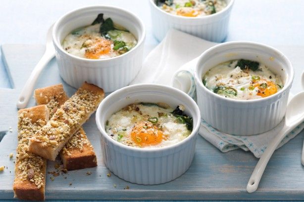 Απλώνουμε το βούτυρο σε φορμάκια των 180 ml. Μοιράζουμε το σπανάκι στα φορμάκια. Ρίχνουμε τη μισή φέτα και το μισό κρεμμυδάκι. Με προσοχή σπάμε το αβγό το αδειάζουμε σε ένα πιατάκι, ελέγχουμε να μην έχει πέσει τσόφλι και στη συνέχεια το βάζουμε προσεκτικά στη φόρμα. Προσοχή: τα βιολογικά αβγά δεν είναι κατάλληλα, σπάνε οι κρόκοι εύκολα. Προσθέτουμε την κρέμα. Βάζουμε από πάνω την υπόλοιπη φέτα και το κρεμμυδάκι και προσθέτουμε αλατοπίπερο.