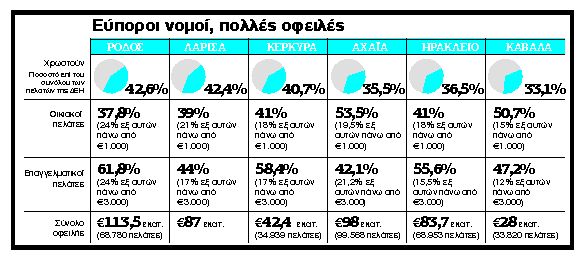 Χαρακτηριστικά παραδείγματα η Ρόδος, το Ηράκλειο Κρήτης, η Κέρκυρα και η Λάρισα, νομοί με παραδοσιακά υψηλότερο εισόδημα από άλλους, όπως για παράδειγμα ο Εβρος, όπου όμως οι κακοπληρωτές και μάλιστα οι συστηματικοί είναι πολλαπλάσιοι. Δεν είναι ίσως τυχαίο ότι σε κάποιες από τις παραπάνω περιοχές δραστηριοποιούνται ισχυρά κινήματα «δεν πληρώνω», γεγονός που εξηγεί και το χαμηλό ενδιαφέρον πολλών καταναλωτών όχι μόνο να ενταχθούν στον ευνοϊκό διακανονισμό της ΔΕΗ για 36 δόσεις, αλλά κυρίως να τον τηρήσουν.