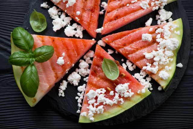 Στα κάρβουνα. Το ψήσιµο του φρούτου στη σχάρα µετατρέπει τα σάκχαρά του σε καραµέλα και δηµιουργεί νέα υφή, ενώ οι υψηλές θερµοκρασίες και οι σταγόνες που πέφτουν στα κάρβουνα του δίνουν καπνιστό άρωµα και γεύση. Και το καλύτερο, τα φρούτα στη σχάρα δεν χάνουν τις βιταµίνες τους και έχουν ελάχιστες θερµίδες.Το καρπούζιείναι ένα από τα καλύτερα φρούτα για τα κάρβουνα. Μπορούµε να το ψήσουµε σε φέτες (2-3 εκατοστά πάχος) µε ή χωρίς τη φλούδα. Απλώς πρέπει να αφαιρέσουµε τα κουκούτσια. Μην το ψήνετε πολλή ώρα, διότι έχει πολλά υγρά και µπορεί να εκραγεί και να προκαλέσει εγκαύµατα. Για τον ίδιο λόγο αφήστε το λίγο να κρυώσει πριν το δαγκώσετε.