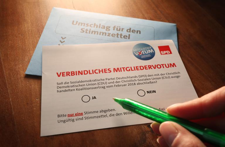 «Συμφωνείτε να επικυρώσουν οι Σοσιαλδημοκράτες τη κυβερνητική συμφωνία με τους Χριστιανοδημοκράτες και Χριστιανοκοινωνιστές στην οποία κατέληξαν τον Φεβρουάριο;». Σε αυτό το ερώτημα καλούνται να απαντήσουν από σήμερα μέχρι και τις 2 Μαρτίου με επιστολική ψήφο τα 463.000 μέλη του SPD. Το αποτέλεσμα της διαδικασίας θα ανακοινωθεί στις 4 Μαρτίου και θα είναι δεσμευτικό για την ηγεσία του κόμματος υπό την προϋπόθεση ότι τουλάχιστον το 20% των μελών του κόμματος θα συμμετάσχουν στην διαδικασία.