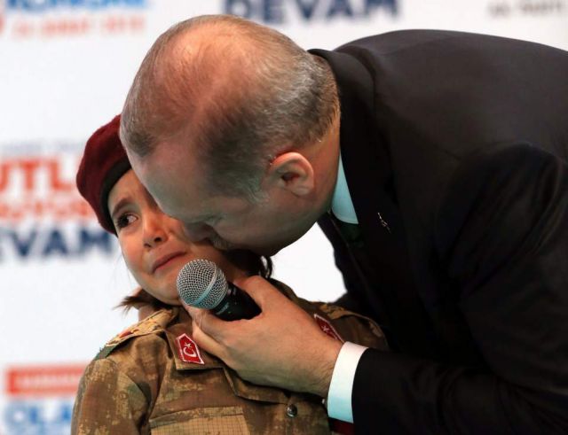 Το μικρό κοριτσάκι φορώντας στο κεφάλι του μπορντό μπερέ, αρχικά αμήχανο και εν συνεχεία βουρκωμένο εμφανίστηκε δίπλα στον Ερντογάν ο οποίος θέλοντας να το καθησυχάσει του είπε: «Αυτοί που φορούν μπορντό μπερέ δεν κλαίνε» .