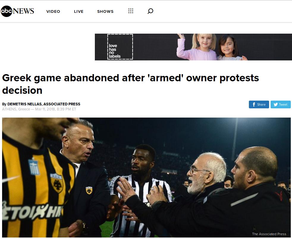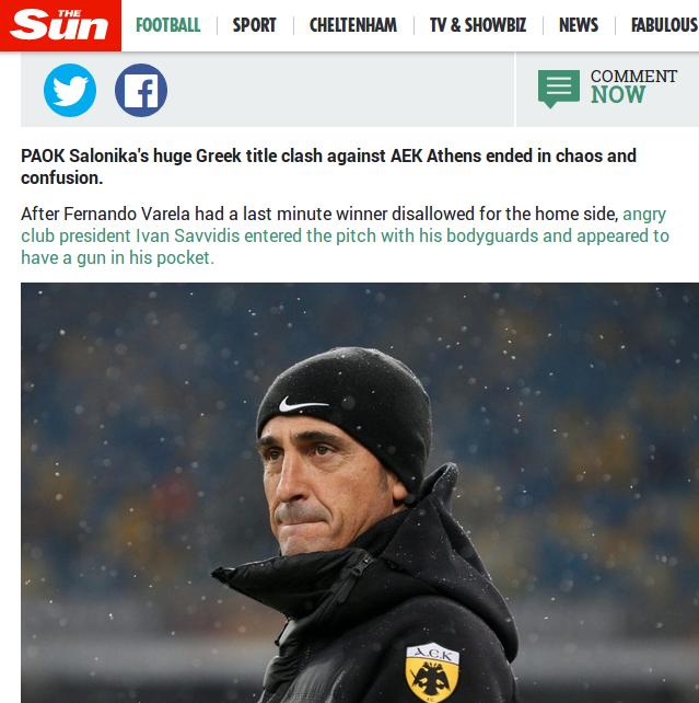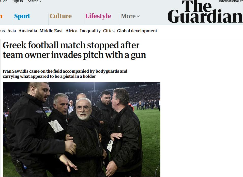 H βρετανική εφημερίδαThe Guardianέχει τίτλο«Ελληνικό ποδοσφαιρικό παιχνίδι διεκόπη, όταν εισέβαλε ιδιοκτήτης ομάδας με όπλο στον αγωνιστικό χώρο».