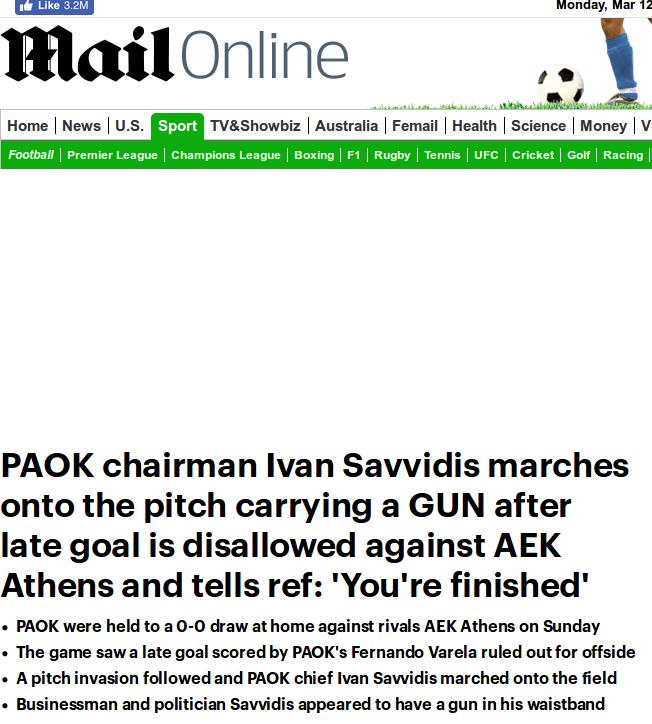 HDaily Mailστέκεται και στην απειλή «Είσαι τελειωμένος ως διαιτητής», που φέρεται να εκστόμισε ο πρόεδρος του ΠΑΟΚ προς τον ρέφερι του αγώνα