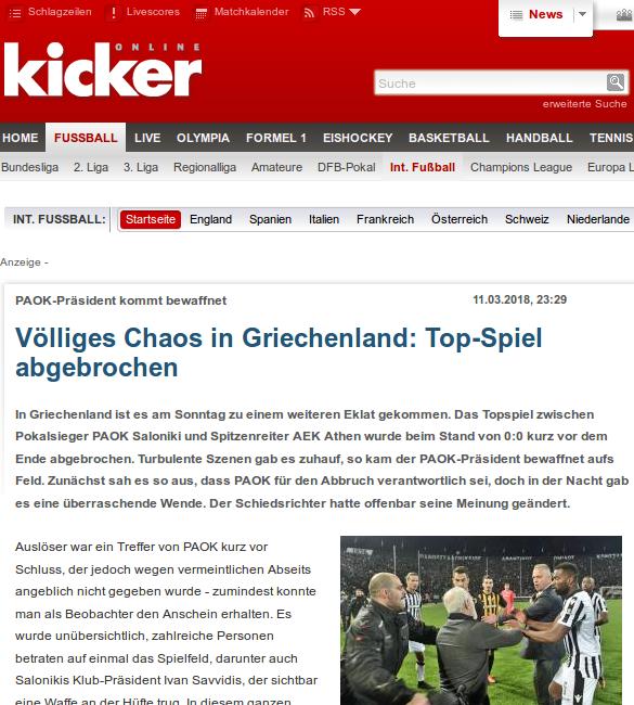 Το γερμανικόKickerσχολιάζει:«Απόλυτο χάος στην Ελλάδα- διεκόπη κορυφαίο παιχνίδι»και στον υπέρτιτλο αναφέρει:«Ο πρόεδρος του ΠΑΟΚ έρχεται οπλισμένος».